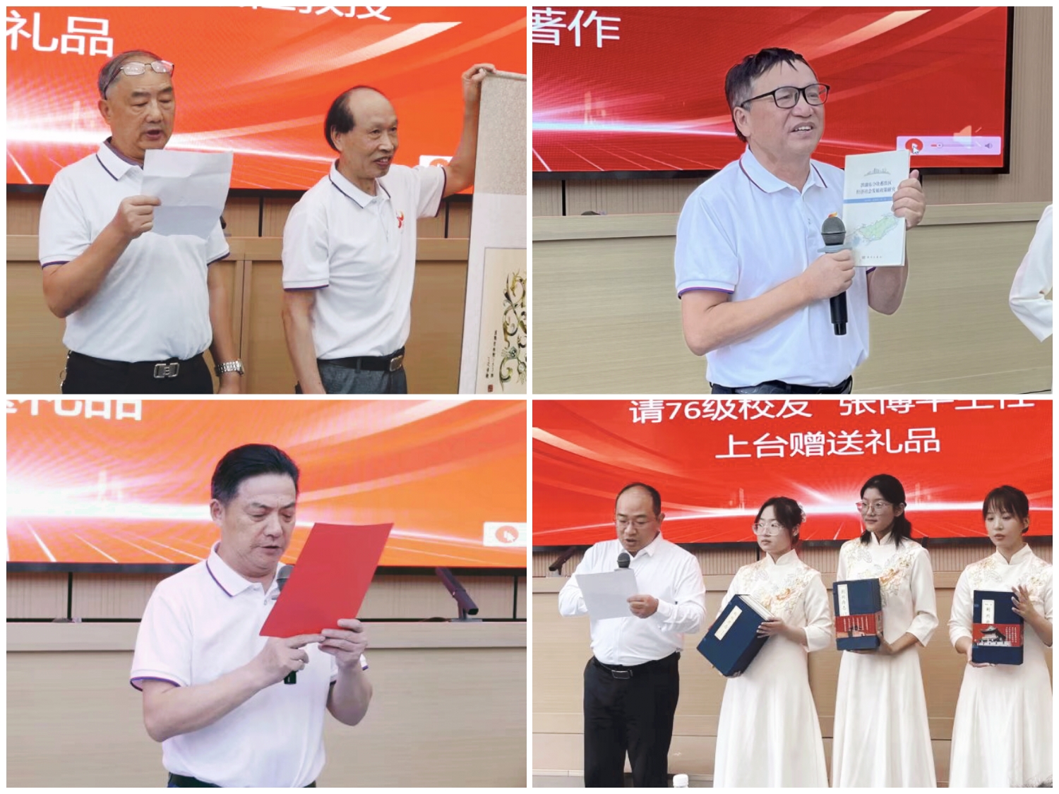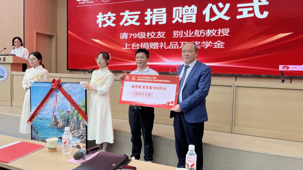 校长赵作斌捐资100万设立“赵作斌奖学金”。同为思政专业79级校友的别业舫代为捐赠了资金和画作,并诵读了赵校长的贺信,字里行间,满是校友对母校的牵挂与祝福,如春风化雨,润泽心田。