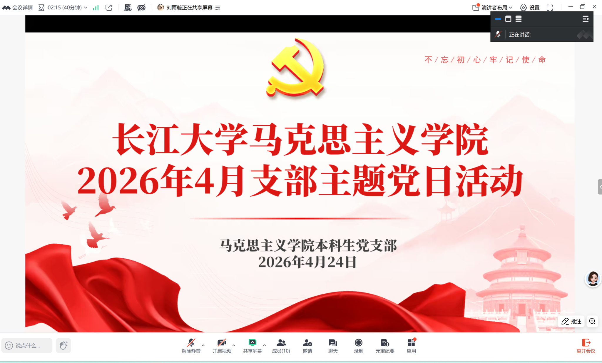 本科生党支部开展4月主题党日活动。本次活动将劳动实践与线上理论学习相结合,引导支部党员在躬行中淬炼党性、在深学中校准政绩观。支部党员以线上线下相结合方式参加活动。