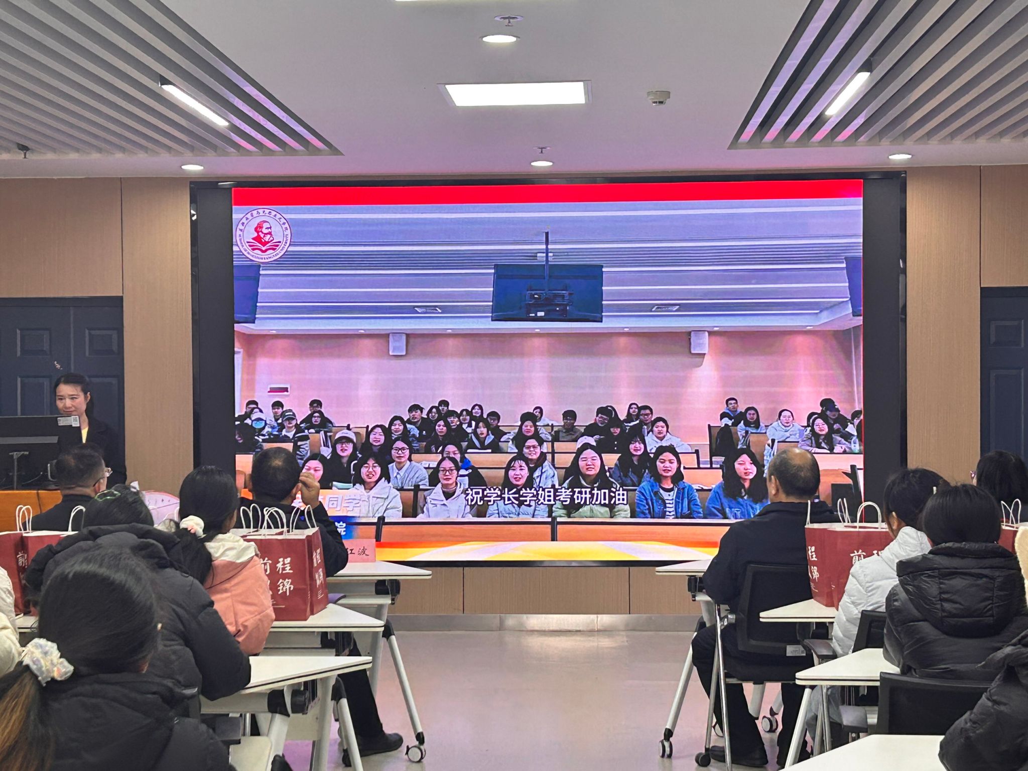 会议伊始,张云雾围绕研招考试考场规则、诚信应考要求及违规处理办法开展考风考纪教育,引导考生筑牢纪律意识,严守考试底线。随后,现场播放考研加油视频,学弟学妹们以真挚的话语为考研学长学姐送上了祝福。