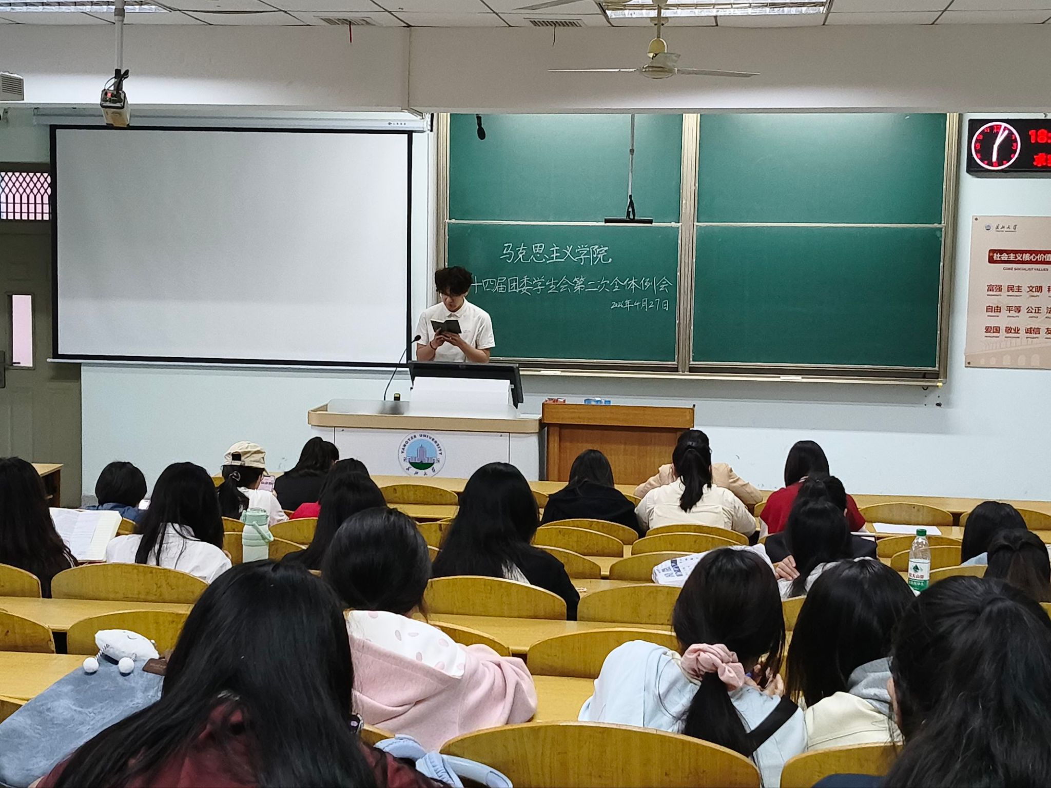 会议伊始,各部门代表依次上台,就近期各项工作开展情况及自我反思进行全面细致汇报。随后,主席团代表徐佳悦进行代表发言,全面总结上一阶段学生会各项工作任务完成情况。发言中明确指出,后续工作要注重合理分配工作任务,避免分工不均,重视师生反馈,根据实际情况及时优化调整工作方案;同时强调全体学生干部要坚守服务同学的根本职责,积极推行工作临时轮值制度,着力培养后备骨干力量,夯实学生会人才队伍建设基础。此外,还围绕下一阶段工作进行了详细规划与全面安排。